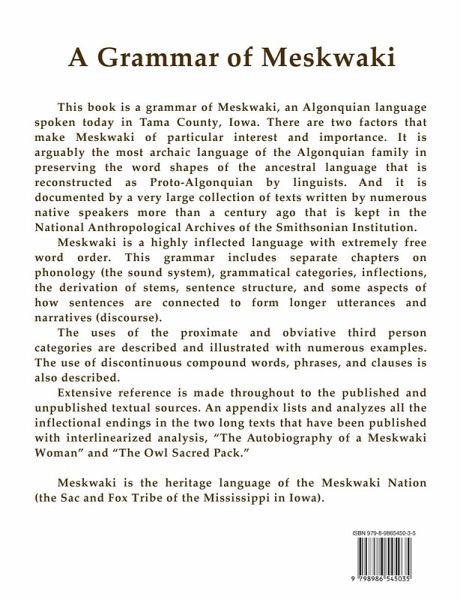 This book is a grammar of Meskwaki, an Algonquian language spoken today in Tama County, Iowa. There are two factors that make Meskwaki of particular interest and importance. It is arguably the most archaic language of the Algonquian family in preserving the word shapes of the ancestral Algonquian language that is reconstructed as Proto-Algonquian by linguists. And it is documented by a very large collection of texts written by numerous native speakers more than a century ago that is kept in the National Anthropological Archives of the Smithsonian Institution. Meskwaki is a highly inflected language with extremely free word order. This grammar includes separate chapters on phonology (the sound system), grammatical categories, inflections, the derivation of stems, sentence structure, and some aspects of how sentences are connected to form longer utterances and narratives (discourse). The uses of the proximate and obviative third person categories are described and illustrated with numerous examples. The use of discontinuous compound words, phrases, and clauses is also described. Extensive reference is made throughout to the published and unpublished textual sources. An appendix lists and analyzes all the inflectional endings in the two long texts that have been published with interlinearized analysis, "The Autobiography of a Meskwaki Woman" and "The Owl Sacred Pack." Meskwaki is the heritage language of the Meskwaki Nation (the Sac and Fox Tribe of the Mississippi in Iowa).