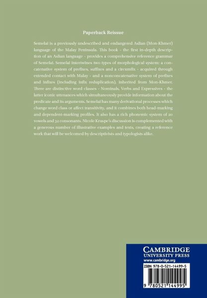 Semelai is a previously undescribed and endangered Aslian (Mon-Khmer) language of the Malay Peninsula. This book - the first in-depth description of an Aslian language - provides a comprehensive reference grammar of Semelai. Semelai intertwines two types of morphological system: a concatenative system of prefixes, suffixes and a circumfix - acquired through extended contact with Malay - and a nonconcatenative system of prefixes and infixes (including infix reduplication), inherited from Mon-Khmer. There are distinctive word classes - Nominals, Verbs and Expressives - the latter iconic utterances which simultaneously provide information about the predicate and its arguments. Semelai has many derivational processes which change word class or affect transitivity, and it combines both head-marking and dependent-marking profiles. It also has a rich phonemic system of 20 vowels and 32 consonants. Nicole Kruspe's discussion is complemented with a generous number of illustrative examples and texts, creating a reference work that will be welcomed by descriptivists and typologists alike.