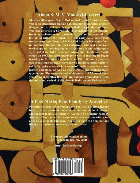 A comprehensive textbook of the early Arabic Kufic script, written as a complete reference book for calligraphers, designers, and students of art history and the history of Arabic language and scripts. This beautiful and powerful script was derived from the earlier Hijazi Mashq style of Mecca and Medina, which was invented by early Muslim scribes to record the Quran. Today, the many historical manuscripts displayed in numerous museums around the world can attest to development and evolution of this remarkable and versatile script. Authored by master calligrapher, Mousavi Jazayeri, this book is the only book written in English that is solely dedicated to the study, learning and revival of the fascinating script behind the first mature Arabic calligraphic style, which was the official script of the Islamic Near East for centuries, before being replaced by the modern Naskh style. In this handbook, Mousavi Jazayeri who had discovered the lost art of cutting the qalam (pen) for early Kufic more than twenty years ago, explains with detailed, clear illustrations how to write early Kufic using a calligraphic pen and even a regular pen. He guides students patiently through the process involved in creating amazing, modern monograms. With clear, ample examples taken from the old Quranic manuscripts, art history students, font designers, and scholars of the history of the Arabic language and scripts can use this reference book to learn the key aspects of the early Kufic script as a writing system. Mr. Mousavi Jazayeri is joined by two co-authors, Perette E. Michelli, a multi-disciplinary historian of medieval and later art, and Saad D. Abulhab, a known Arabic type designer and independent scholar of the history of Arabic language and scripts. The two co-authors are members of the first international group dedicated to the study and revival of the early Kufic script, Kuficpedia, which was formed a few years ago around the historical achievements of Mr. Mousavi.