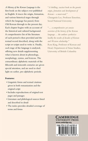 A History of the Korean Language is the first book on the subject ever published in English. It traces the origin, formation, and various historical stages through which the language has passed, from Old Korean through to the present day. Each chapter begins with an account of the historical and cultural background. A comprehensive list of the literature of each period is then provided and the textual record described, along with the script or scripts used to write it. Finally, each stage of the language is analyzed, offering new details supplementing what is known about its phonology, morphology, syntax, and lexicon. The extraordinary alphabetic materials of the 15th and 16th centuries are given special attention, and are used to shed light on earlier, pre-alphabetic periods.