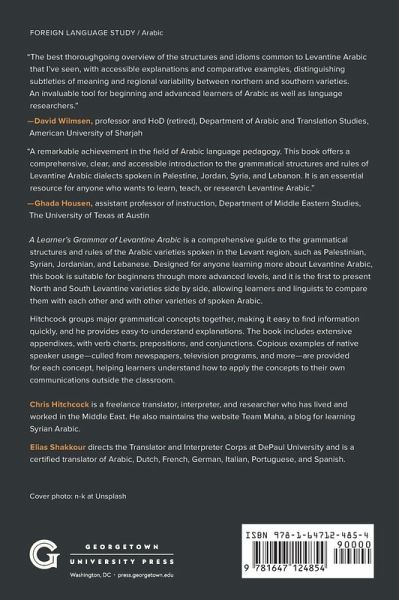 An accessible grammar reference guide for learners of Levantine Arabic at all levels A Learner's Grammar of Levantine Arabic is a comprehensive guide to the grammatical structures and rules of the Arabic varieties spoken in the Levant region, such as Palestinian, Syrian, Jordanian, and Lebanese. This book is suitable for beginners through more advanced levels, and it is the first to present North and South Levantine varieties side by side, allowing learners and linguists to compare them with each other and with other varieties of spoken Arabic. Hitchcock groups major grammatical concepts together, making it easy to find information quickly, and he provides easy-to-understand explanations. The book includes extensive appendixes, with verb charts, prepositions, and conjunctions. Copious examples of native speaker usage-culled from newspapers, television programs, and more--are provided for each concept, helping learners understand how to apply the concepts to their own communications outside the classroom.
