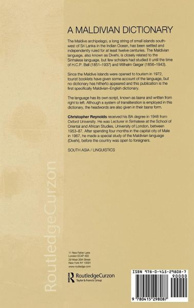 Maldivian (also known as Divehi) is spoken on the Maldive Islands located off the southwest tip of India in the Indian Ocean. It is an Indo-Aryan language, formerly written in a script resembling Sinhalese script. After the islands became exclusively Islamic, it was found convenient to design a script reading from right to left, so that Arabic words could be accommodated in Maldivian sentences. An official scheme of roman transliteration for Maldivian was adopted by the Maldive government in the 1970s. This Maldivian-English Dictionary consists of 5000 individual entries.