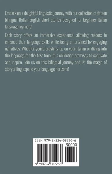 Embark on a delightful linguistic journey with our collection of fifteen bilingual Italian-English short stories designed for beginner Italian language learners! Each story offers an immersive experience, allowing readers to enhance their language skills while being entertained by engaging narratives. Whether you're brushing up on your Italian or diving into the language for the first time, this collection promises to captivate and inspire. Join us on this bilingual journey and let the magic of storytelling expand your language horizons!