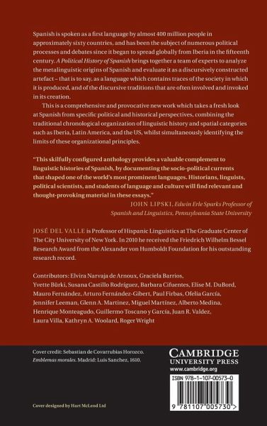 Spanish is spoken as a first language by almost 400 million people in approximately 60 countries, and has been the subject of numerous political processes and debates since it began to spread globally from Iberia in the thirteenth century. A Political History of Spanish brings together a team of experts to analyze the metalinguistic origins of Spanish and evaluate it as a discursively constructed artefact; that is to say, as a language which contains traces of the society in which it is produced, and of the discursive traditions that are often involved and invoked in its creation. This is a comprehensive and provocative new work which takes a fresh look at Spanish from specific political and historical perspectives, combining the traditional chronological organization of linguistic history and spatial categories such as Iberia, Latin America and the US, whilst simultaneously identifying the limits of these organizational principles.