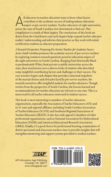 All educators in teacher education want to know what factors contribute to the academic success of undergraduate education majors or pre-service teachers. Teacher educators of eight universities across the state of South Carolina were determined to find out. This compilation is a result of their inquiry. The conclusions of this book are drawn from the contributors and each chapter helps expand teacher educator readers' understanding and informs their practice as they work with initial certification students in educator preparation. A Research Perspective promotes the academic success of pre-service teachers by exploring common research questions posed to education majors of the eight universities in South Carolina. Ranging from historically Black to predominately White, from private to public universities across the state, these institutions serve a diverse body of students who described some insightful contributing factors and challenges to their success. The case scenario begins each chapter that provides contextual snapshots of the myriad choices and obstacles faced by pre-service teachers; the research narratives offer insightful analysis for teacher educators. Though written from the perspective of South Carolina, the lessons learned and recommendations for teacher education are relevant to any state. This is a must-read for all teacher educators interested in student success. This book is also interesting to members of teacher education organizations, especially the Association of Teacher Educators (ATE) and its 41 state and regional affiliates, including South Carolina Association of Teacher Educators (SCATE) and Southeast Regional Association of Teacher Educators (SRATE). It also has wide appeal to members of other professional organizations, such as National Association for Multicultural Education (NAME) and American Educational Research Association (AERA). Finally, this book is a good choice for professional learning communities of district personnel and classroom teachers since it provides insights that will strengthen mentoring and support systems provided to student teachers.