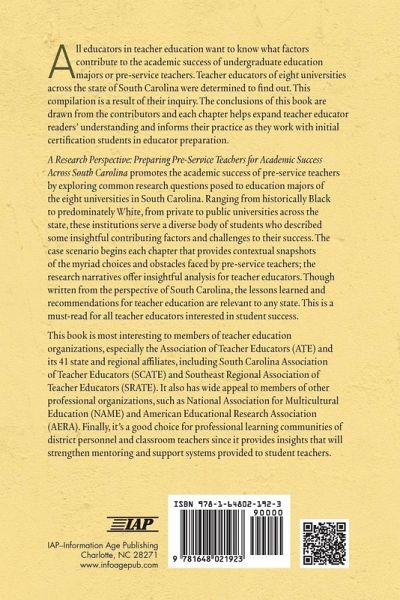 All educators in teacher education want to know what factors contribute to the academic success of undergraduate education majors or pre-service teachers. Teacher educators of eight universities across the state of South Carolina were determined to find out. This compilation is a result of their inquiry. The conclusions of this book are drawn from the contributors and each chapter helps expand teacher educator readers' understanding and informs their practice as they work with initial certification students in educator preparation. A Research Perspective promotes the academic success of pre-service teachers by exploring common research questions posed to education majors of the eight universities in South Carolina. Ranging from historically Black to predominately White, from private to public universities across the state, these institutions serve a diverse body of students who described some insightful contributing factors and challenges to their success. The case scenario begins each chapter that provides contextual snapshots of the myriad choices and obstacles faced by pre-service teachers; the research narratives offer insightful analysis for teacher educators. Though written from the perspective of South Carolina, the lessons learned and recommendations for teacher education are relevant to any state. This is a must-read for all teacher educators interested in student success. This book is also interesting to members of teacher education organizations, especially the Association of Teacher Educators (ATE) and its 41 state and regional affiliates, including South Carolina Association of Teacher Educators (SCATE) and Southeast Regional Association of Teacher Educators (SRATE). It also has wide appeal to members of other professional organizations, such as National Association for Multicultural Education (NAME) and American Educational Research Association (AERA). Finally, this book is a good choice for professional learning communities of district personnel and classroom teachers since it provides insights that will strengthen mentoring and support systems provided to student teachers.
