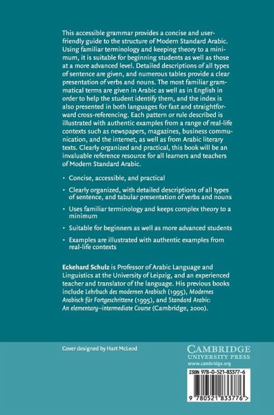 This accessible grammar provides a concise and user-friendly guide to the structure of Modern Standard Arabic. Using familiar terminology and keeping theory to a minimum, it is suitable for beginning students as well as those at a more advanced level. Detailed descriptions of all types of sentence are given, and numerous tables provide a clear presentation of verbs and nouns. The most familiar grammatical terms are given in Arabic as well as in English in order to help the student identify them, and the index is also presented in both languages for fast and straightforward cross referencing. Each pattern or rule described is illustrated with authentic examples from a range of real-life contexts such as newspapers, magazines, business communication and the Internet, as well as from Arabic literary texts. Clearly organised and practical, this book will be an invaluable reference resource for all learners and teachers of Modern Standard Arabic.