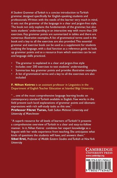 A Student Grammar of Turkish is a concise introduction to Turkish grammar, designed specifically for English-speaking students and professionals. Written with the needs of the learner very much in mind, it sets out the grammar of the language in a clear and jargon-free style. The book not only explains the fundamentals of the grammar, but also tests students' understanding in an interactive way with more than 200 exercises. Key grammar points are summarised in tables and there are numerous illustrative examples. A list of grammatical terms used in the book and a key to all the exercises are also provided. This essential grammar and exercise book can be used as a supplement for students studying the language, with a dual function as a reference guide to look up grammar points, and as a resource from which exercises can be set and language skills practised.