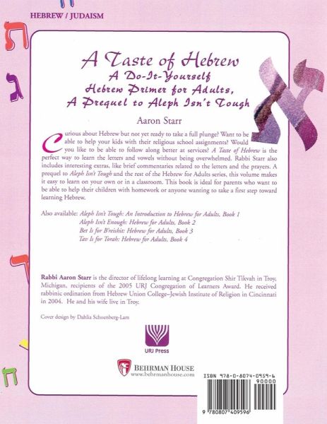 A Do-It-Yourself Hebrew Primer for Adults, A Prequel to Aleph Isn't Tough Curious about Hebrew but not ready to take the plunge? A Taste of Hebrew is the perfect way to learn the letters and vowels without being overwhelmed by exercises and drills. Rabbi Starr includes interesting extras like brief commentaries related to the letters and tidbits on the prayers that you can peruse as you study. A prequel to Aleph Isn't Tough and the rest of the Hebrew for Adults series, this slim volume makes it easy to learn on your own or in a class. Ideal for parents who want to be able to help their children with religious school homework, or anyone wanting to take a first step into Hebrew.