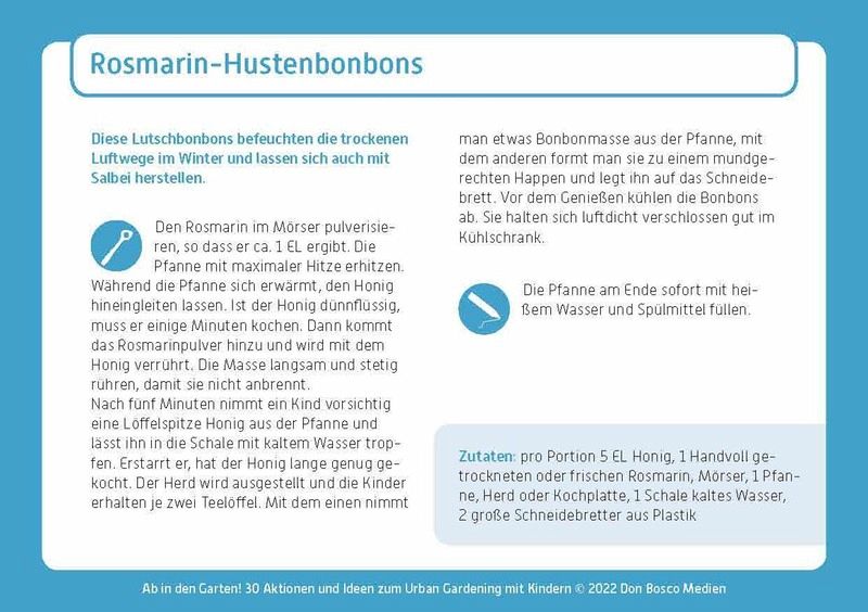 Wie lockt man Regenwürmer an? Kann man aus Brennnesseln Dünger herstellen? Diese 30 spannenden Gartenprojekte und Rezepte bringen Kinder in Kontakt mit Erde und Pflanzen und wecken die Lust am Experimentieren. Ob Basteln für den Garten, Samen ziehen, Vogelfutter herstellen oder Kräuter-Bonbons selbst kochen - es kann einfach losgelegt werden, denn die jahreszeitlich passende Idee ist dank der Bildkarten schnell zur Hand.