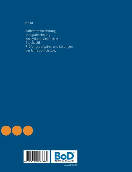 Dieses Buch dient Ihrer Vorbereitung auf das Mathematik Abitur 2018. Alle relevanten Themen werden noch einmal anschaulich wiederholt und mit einfachen Beispielrechnungen und Abbildungen veranschaulicht. Enthalten sind außerdem die Prüfungsaufgaben der letzten Jahre mit ausführlichen Lösungswegen.Auf meiner Homepage www.elearning-freiburg.de finden Sie zu Ihrer Unterstützung weitere Materialien wie Vorträge, Videotutorials und weitere Prüfungsaufgaben.