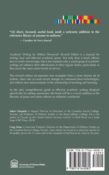 Academic Writing: A Guide for Military Personnel is a manual for writing clear and effective academic prose. Authored by an experience writing instructor and a retired military officer, both of whom now teach in a professional military education institution, it is directed at members of the armed forces who are entering, or perhaps re-entering, the academic community having spent much of their careers either writing in the professional military context or not writing at all. The book not only teaches officers how to write convincingly, but also explains why a sound grasp of academic writing can enhance their effectiveness in their regular duties, particularly as they reach the more senior levels of service. Chapters focus on the value of written communication skills, the difference between professional (staff) and academic writing, the research process, the writing process, academic professionalism, and common writing problems and challenges. A particularly innovative final chapter discusses how officers can use the knowledge that they have acquired through their professional experiences in the academic context. Specific examples - chosen with a military audience in mind - are integrated throughout the text to provide the reader with relevant and practical guidance. The revised edition incorporates new examples from a more diverse set of authors, takes into account recent changes in communication technologies, and reflects new advancements in the scholarship of teaching and learning. As the only comprehensive guide to effective academic writing designed specifically for military personnel, this book will be a crucial addition to the libraries of junior and senior officers in militaries worldwide. Available formats: trade paperback, accessible PDF, and accessible ePub