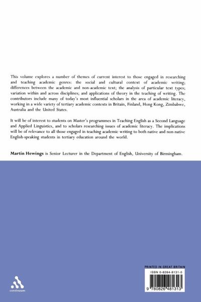 This volume explores a number of themes of current interest to those engaged in researching and teaching academic genres: the social and cultural context of academic writing; differences between the academic and non-academic text; the analysis of particular text types; variation within and across disciplines; and applications of theory in the teaching of writing. The contributors include many of today's most influential scholars in the area of academic literacy, working in a wide variety of tertiary academic contexts in Britain, Finland, Hong Kong, Zimbabwe, Australia and the United States. The implications will be of relevance to all those engaged in teaching academic writing to both native and non-native English speaking students in tertiary education around the world.