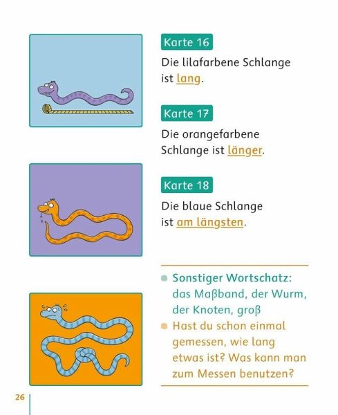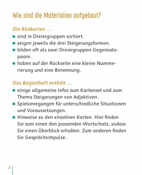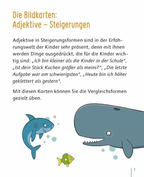 Bildkarten zur Sprachförderung für Kita, Kindergarten und erstes Schuljahr, geeignet für Kinder ab 3 Jahren +++ Schnell, schneller, am schnellsten - mit diesen lustigen und motivierenden Bildkartenmotiven üben die Kinder spielerisch, aber ganz gezielt, Adjektive zu steigern. Je drei Motive zur Sprachförderung von Kindern lassen sich zu einer Bildfolge zusammenlegen. Ob einzeln, zu zweit oder in der ganzen Gruppe - zahlreiche Spielideen ermöglichen einen vielfältigen Einsatz der Bildkarten. Ideal zur Sprachförderung in Kindergarten, Grundschule und DaZ. Inkl. Bildkarten als Malvorlagen zum Download mit weiterführenden Ideen.Informationen zur Reihe:Sprache gezielt fördern, um allen Kindern die gleichen Voraussetzungen für einen erfolgreichen Schulstart zu ermöglichen: Mit diesen Bildkartensets erweitern die Kinder spielerisch und kindgemäß ihre sprachlichen Ausdrucksmöglichkeiten und trainieren zugleich auch die visuelle Wahrnehmung. Wortschatzarbeit, Syntaxschulung oder kreative Erzählanlässe - die Karten sind vielfältig einsetzbar und decken alle Sprachförderbereiche ab.