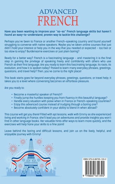 Have you been wanting to improve your "so-so" French language skills but haven't found an easy-to-understand, proven way to tackle this challenge? Perhaps you've been to France or another French-speaking country and found yourself struggling to converse with native speakers. Maybe you've taken online courses that just didn't hold your interest or help you in the way that you needed or expected - too fast or too slow to enjoy? Burdensome exercises or just plain boring? Ready for a better way? French is a fascinating language - and mastering it is the final step in gaining the privilege of speaking freely and confidently with others who use French as their first language. Are you ready to learn this fascinating language, its roots, its evolution, and how it is spoken today? Poised to learn many everyday phrases, greetings, questions, and travel help? Then, you've come to the right place! This book starts goes far beyond everyday phrases, greetings, questions, or travel help; it takes you to a level where conversing becomes an effortless pleasure. Are you ready to: Become a masterful speaker of French? Finally jump the hurdles keeping you from fluency in this beautiful language? Handle every situation with poise when in France or French-speaking countries? Enjoy this advanced course instead of trudging through a boring one? Become absolutely confident in your ability to blend in when abroad? This course will get you there! Filled with apt lessons, walk with Emmy as she experienced living and working in France; she'll lead you on adventures and provide insights you won't find in other language books. Her valuable hints offer ways to learn more quickly, and the exercises will help hone your skills to a fine point! Leave behind the boring and difficult lessons, and join us on the lively, helpful, and enjoyable journey with Emmy!