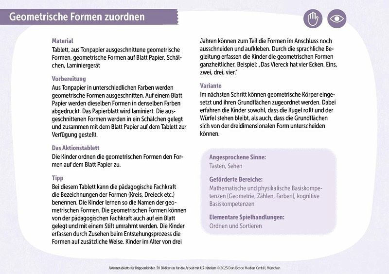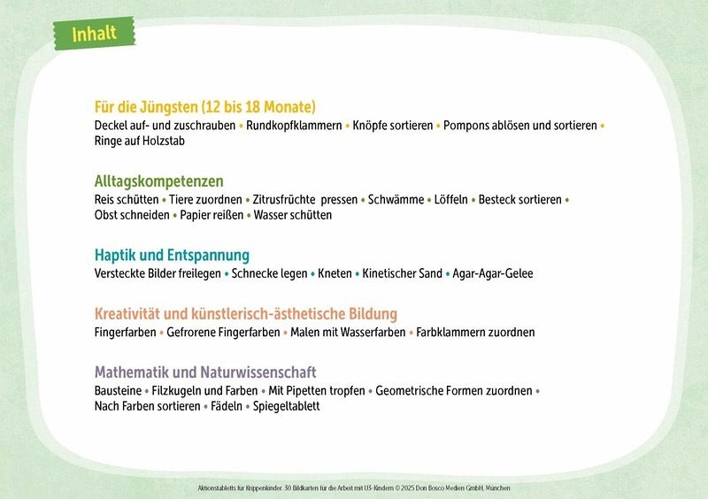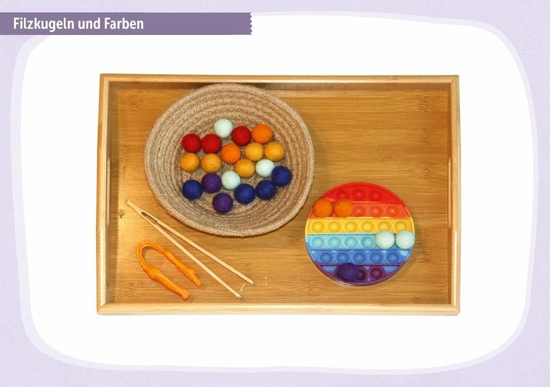 Lernen mit allen Sinnen: Schleim selber machen, Reis rieseln lassen, Farben sortieren uvm.Inspiriert von Montessori: Tablett-Aktionen, die die Sinneswahrnehmung fördernIdeal für Kreativangebote in der Krippe: Lässt Kinder Selbstwirksamkeit erfahrenNur wenig Vorbereitung nötig: leicht umzusetzen dank klarer Anleitungen Mit methodischen Hinweisen und Erklärungen zu den angesprochenen Bildungsbereichen