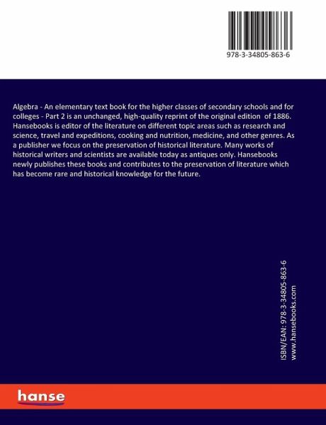 Algebra - An elementary text book for the higher classes of secondary schools and for colleges - Part 2 is an unchanged, high-quality reprint of the original edition of 1886.Hansebooks is editor of the literature on different topic areas such as research and science, travel and expeditions, cooking and nutrition, medicine, and other genres. As a publisher we focus on the preservation of historical literature. Many works of historical writers and scientists are available today as antiques only. Hansebooks newly publishes these books and contributes to the preservation of literature which has become rare and historical knowledge for the future.