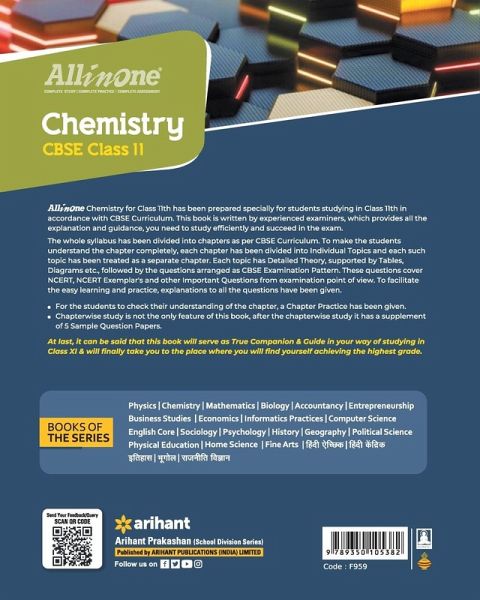 BOOK STRUCTURE 1. Complete syllabus coverage in 9 chapters 2. 5 Sample Question Papers BOOK FEATURES 1. Formulated as per the Rationalised NCERT & Latest CBSE Syllabus 2023-24 2. Complete theory in each chapter 3. Topical Exercises for a smooth part-by-part understanding of each chapter 4. Exam Practice Section contains Exam Pattern Questions 5. Selected NCERT and NCERT Exemplar Questions for School/Board exam practice 6. Chapter Summary to quickly revise the chapter 7. Sample Question Papers prepared exactly on the latest syllabus & pattern of examination WHY THIS BOOK? 1. Fully revised for class 11th and CBSE Exams 2024 2. Complete Study: Well-explained theories in each chapter 3. Complete Practice: Exam practice exercise, NCERT questions, and NCERT exemplar problems 4. Complete Assessment: Sample Questions Papers for rigorous practice 5. The study material is in a clear & concise form 6. The book ensures complete preparation and practice to succeed in the exam TABLE OF CONTENT: Some Basic Concepts of Chemistry, Structure of Atom, Classification of Elements and Periodicity in Properties, Chemical Bonding and Molecular Structure, Thermodynamics, Equilibrium, Redox Reactions, Organic Chemistry: Some Basic Principles and Techniques, Hydrocarbons, Sample Question Papers (1-5)