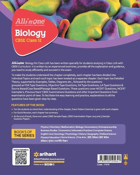 BOOK STRUCTURE 1. Complete syllabus coverage in 13 chapters 2. CBSE Examination Paper 2023 3. Latest CBSE Sample Paper 4. 3 Sample Question Papers BOOK FEATURES 1. Formulated as per the Rationalised NCERT & Latest CBSE Syllabus 2023-24 2. Complete theory & chapter summary in each chapter 3. Topical Exercises for a smooth part-by-part understanding of each chapter 4. NCERT & NCERT Exemplar Problems for School/Board Exam Practice 5. Exam Practice Section contains Exam Pattern Questions 6. In-detailed solved Board Exam Questions in each chapter 7. Sample Question Papers prepared exactly on the latest syllabus & pattern of examination WHY THIS BOOK? 1. Fully revised for class 12th and CBSE Exams 2024 2. Complete Study: Well-explained theories in each chapter 3. Complete Practice: Topical Exercise, NCERT Exemplar Problems, Exam Pattern Exercise, and board exams' questions 4. Complete Assessment: 3 Sample Questions Papers for rigorous practice 5. The study material is in a clear & concise form 6. The book ensures complete preparation and practice to succeed in the exam TABLE OF CONTENT: Sexual Reproduction in Flowering Plants, Human Reproduction, Reproductive Health, Principles of Inheritance and variation, Molecular Basis of Inheritance, Evolution, Human Health and Diseases, Microbes in Human Welfare, Biotechnology: Principles and Processes, Biotechnology and its applications, Organisms and Populations, Ecosystem, Biodiversity and its conversation, CBSE Examination Paper 2023, Latest CBSE Sample Paper, 3 Sample Question Papers