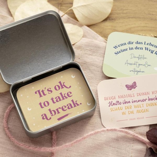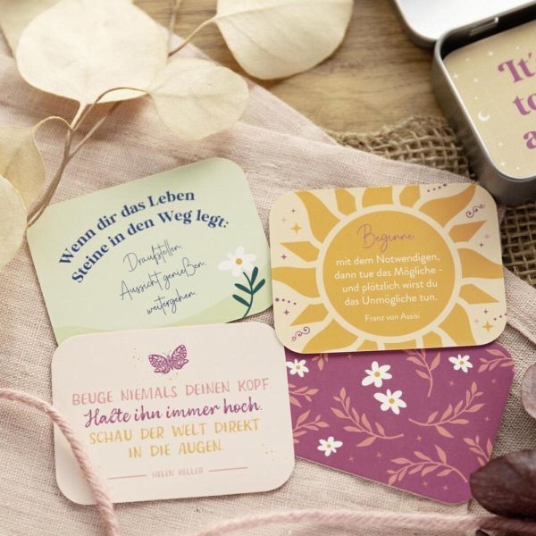 Die Karten im attraktiven Metalldöschen sind ein wunderbares Geschenk - sowohl als Komplettpaket als auch jede Karte einzeln. Ob für die beste Freundin, Schwester, Kollegin oder Mama - für alle Alltagsheldinnen gibt es hier ein passendes Kompliment und einen herrlichen Energie-Booster!