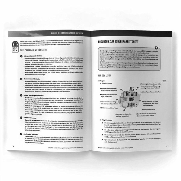 Verweise auf den Einsatz des Schülerarbeitsheftes (ISBN: 978-3-96323-134-6) zu Als die Welt uns gehörte im Unterricht mit didaktisch-methodischen Hinweisen Einsatz des Hörbuchs und der Hörtexte Kapitelzusammenfassungen historische Informationstexte und didaktische Kommentare zu den Kapiteln weiterführende Arbeitsblätter zu ausgewählten Themen zur weiteren Vertiefung Hörtexte zur Verwendung im Unterricht Lösungen zu den Aufgaben des Schülerarbeitsheftes Lösungsvorschläge und Hinweise zu den Schreibaufgaben im Schülerarbeitsheft