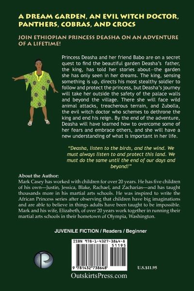 Princess Deasha is on a quest to find the garden her father the king has told her stories about. She dreams of the garden and her mother. She convinces a friend, Babo, to help her on her adventure. The king, sensing something is up, directs a great solder to follow and protect the princess. Ebad the solder is a master at staying silent and hidden. His stealth is the best among the troops. The king doesn't know that Deasha's adventure will take her outside the palace and even outside the village. The group ends up fighting off wild animals and treacherous terrain. They didn't know it but an evil witch doctor named Zubolla was behind the animal attacks. He doesn't like the king or the princess, he wants to end their line and reign. This episode teaches Deasha what is important in her life. She also learns to over come some fears and embrace others. This journey is a fantastic view of how a young mind sees the world they live in. This is the kind of book that everyone can relate to especially African-American girls looking for a strong figure to relate too.
