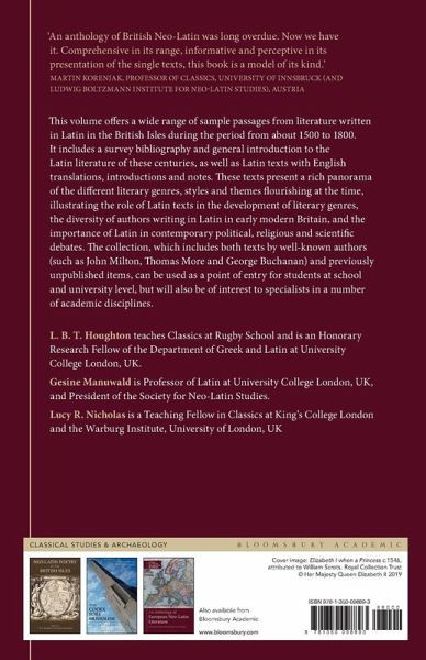 List of Illustrations List of Contributors Preface INTRODUCTION (L. B. T. Houghton, UCL, UK Gesine Manuwald, UCL, UK and Lucy R. Nicholas, KCL and UCL, UK) 1 Neo-Latin as a Literary Medium 2 British Neo-Latin Literature 3 Overview of Neo-Latin Literary Genres 4 Aims and Coverage of this Volume 5 Latin Texts: Sources and Conventions 6 Further Reading TEXTS 1 Utopia: Elsewhere and Nowhere Thomas More (1478-1535), Extracts from Utopia (Lucy R. Nicholas, KCL and UCL, UK) 2 An Early Tudor Antiquarian at Bath John Leland (c. 1503-1552), De thermis Britannicis (Andrew W. Taylor, University of Cambridge, UK) 3 The Nature of the Universe George Buchanan (1506-1582), De sphaera 1.1-51 (David McOmish, University of Glasgow, UK) 4 A Celebration of Queen Elizabeth I's Coronation in Verse Walter Haddon (1515-1572), In . Elisabethae regimen (Lucy R. Nicholas, KCL and UCL, UK) 5 The Latin University Orations of Queen Elizabeth I Queen Elizabeth I (1533-1603), Speeches of 1566 and 1592 (Sarah Knight, University of Leicester, UK) 6 Female Funerary Verse Elizabeth Hoby, Lady Russell (1540-1609), Epitaphic Poems (Lucy R. Nicholas, KCL and UCL, UK) 7 On Writing about Britain William Camden (1551-1623), Prefatory Letter to Britannia (Gesine Manuwald, UCL, UK) 8 A Birthday Poem for Christ Adam King (c. 1560-1620), Genethliacon Iesu Christi (c. 1586) (David McOmish, University of Glasgow, UK) 9 On Poetry, Politics and Religion John Owen (c. 1560-1622), Selection of Epigrams (Gesine Manuwald, UCL, UK) 10 A Comic Exorcism George Ruggle (1575-1622), Ignoramus IV 11 (Daniel Hadas, KCL, UK) 11 'Dazel'd thus with height of place': An English Lyric in Two Latin Versions English: Henry Wotton (1568-1639); Latin: Anonymous [Georg Weckherlin (1584-1653)?] (Victoria Moul, KCL, UK) 12 A Meeting in Mauritania John Barclay (1582-1621), Argenis, Book 5, Chapter 8 (9) (Jacqueline Glomski, UCL, UK) 13 The Gunpowder Plot John Milton (1608-1674), In Quintum Novembris (Stephen Harrison, University of Oxford, UK) 14 A Frost Fair on the Thames William Baker, Descriptio Brumae (1634/5) (George Pounder, Glenalmond College, Scotland) 15 The Beauty and Horror of the Mountains Thomas Burnet (c. 1635-1715), Telluris theoria sacra 1.1.9 (William M. Barton, Ludwig Boltzmann Institute for Neo-Latin Studies, Innsbruck, Austria) 16 A Satire on the Bishop of Salisbury Anonymous (Thomas Brown?), In Episcopum Quendam (c. 1689) (Victoria Moul, KCL, UK) 17 A View of the Scottish Highlands James Philp (1656/7-c. 1713), Grameid 3.10-36 (L. B. T. Houghton, UCL, UK) 18 Thomas Gray Prophesies Space Travel Thomas Gray (1716-1771), Luna habitabilis 51-72, 78-95 (L. B. T. Houghton, UCL, UK) Index