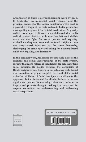 Ambedkar's work goes beyond mere criticism; it is a thorough analysis and an uncompromising indictment of the caste system and the social injustices it perpetuates. In this text, Ambedkar argues that the caste system is fundamentally incompatible with the ideals of equality, liberty, and fraternity. He critiques Hindu scriptures that justify and sustain caste hierarchies and calls for a radical restructuring of Indian society. Ambedkar's work also addresses the psychological and moral degradation imposed on lower-caste individuals and the urgent need for social reform to achieve true democracy. "Annihilation of Caste" is not just a critique of a social system but a passionate call to action. It has been influential in shaping Dalit movements and continues to be a vital text in discussions on caste, social justice, and human rights in India. The book's relevance persists as it challenges readers to reflect on and address ongoing inequalities and injustices in society.