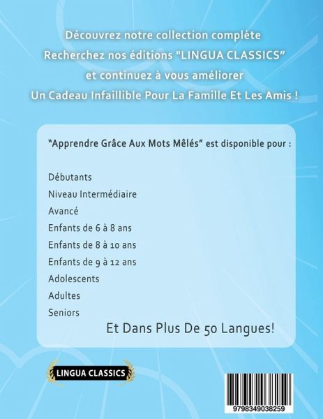 * APPRENDRE LE DANOIS TOUT EN S'AMUSANT - ENRICHISSEZ VOTRE VOCABULAIRE FACILEMENT ! Les Mots Mêlés Sont Une Technique D'Apprentissage Efficace Utilisée Dans Les Écoles Pour Améliorer Son Vocabulaire - C'est Un Jeu Idéal Pour Stimuler L'Apprentissage ! Cette série de livres a été conçue en fonction du niveau de chaque personne. Que vous soyez débutant, intermédiaire ou que vous aidiez votre enfant à apprendre une nouvelle langue, vous trouverez le livre qui répondra à vos besoins. Comment ? Améliorez votre niveau avec une activité stimulante ! C'est un excellent complément pour tous ceux qui apprennent une langue. Avec +40 heures de divertissement, vous découvrirez et pourrez apprendre à retenir plus de 2000 mots. UN LIVRE D'ÉTUDE UNIQUE : - VOCABULAIRE SPÉCIFIQUE : Profitez d'une sélection par âge et par niveau de +2000 mots - APPRENTISSAGE ACTIF : Un espace permet au lecteur de réaliser sa propre traduction - PUZZLES EN GRAND FORMAT : Conçus pour la meilleure lisibilité possible. - FEUILLETEZ AVANT D’ACHETER : Pas de surprise, cliquez sur la couverture - SOLUTIONS FACILEMENT LISIBLES : Des solutions dans un format clair et simple - DIVERTISSEMENT : Assez difficile pour être stimulant, assez facile pour devenir addict DÉVELOPPEZ VOS COMPÉTENCES LINGUISTIQUES : - Pratique Les jeux de mots mêlés transforment le défi d'apprendre une langue en un plaisir ! - Progressez Apprenez avec un vocabulaire commun adapté à vos compétences. - Retenez ce que vous apprenez Une technique d'apprentissage active pour augmenter votre vocabulaire. - Atteignez vos objectifs Ne vous contentez pas de pratiquer passivement. Cherchez les traductions de nouveaux mots - trouvez-les dans le Puzzle - ajoutez-les à votre vocabulaire ! DISPONIBLE DANS PLUS DE 50 LANGUES POUR : - Débutant - Intermédiaire - Avancé - Enfants de 6 à 8 ans - Enfants de 8 à 10 ans - Enfants de 9 à 12 ans - Adolescents - Adultes - Seniors Consultez notre collection complète - Recherchez ""LINGUA CLASSICS"" et découvrez de nouveaux livres pour vous améliorer - un cadeau infaillible pour votre famille et vos amis ! Profitez dès maintenant de cet apprentissage ludique - DEVENEZ AMIS AVEC UNE NOUVELLE LANGUE FACILEMENT ! ------- [ENGLISH] ------- Note: Some content in English might be missing due to length restrictions. * LEARN DANISH WHILE HAVING FUN - BUILD VOCABULARY EASILY! Word Searches Are an Effective Technique Used in Schools to Increase Vocabulary - It’s an Ideal Game to Stimulate Learning! This book series has been tailored to each person’s specific level. Whether you are a beginner, advanced, or helping your child learn a new language you’ll find the right book for your needs. Why? It’s a great complement for anyone learning a language. Make it easy with an encouraging activity! With +40 hours of entertainment, you will discover and be able to retain over 2000 words: AN EXCITING STUDY COMPANION WITH: - AGE & LEV...