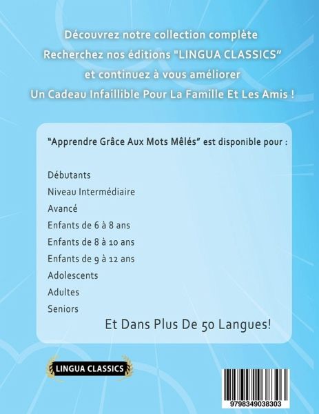 * APPRENDRE L'ESPAGNOL TOUT EN S'AMUSANT - ENRICHISSEZ VOTRE VOCABULAIRE FACILEMENT ! Les Mots Mêlés Sont Une Technique D'Apprentissage Efficace Utilisée Dans Les Écoles Pour Améliorer Son Vocabulaire - C'est Un Jeu Idéal Pour Stimuler L'Apprentissage ! Cette série de livres a été conçue en fonction du niveau de chaque personne. Que vous soyez débutant, intermédiaire ou que vous aidiez votre enfant à apprendre une nouvelle langue, vous trouverez le livre qui répondra à vos besoins. Comment ? Améliorez votre niveau avec une activité stimulante ! C'est un excellent complément pour tous ceux qui apprennent une langue. Avec +40 heures de divertissement, vous découvrirez et pourrez apprendre à retenir plus de 2000 mots. UN LIVRE D'ÉTUDE UNIQUE : - VOCABULAIRE SPÉCIFIQUE : Profitez d'une sélection par âge et par niveau de +2000 mots - APPRENTISSAGE ACTIF : Un espace permet au lecteur de réaliser sa propre traduction - PUZZLES EN GRAND FORMAT : Conçus pour la meilleure lisibilité possible. - FEUILLETEZ AVANT D’ACHETER : Pas de surprise, cliquez sur la couverture - SOLUTIONS FACILEMENT LISIBLES : Des solutions dans un format clair et simple - DIVERTISSEMENT : Assez difficile pour être stimulant, assez facile pour devenir addict DÉVELOPPEZ VOS COMPÉTENCES LINGUISTIQUES : - Pratique Les jeux de mots mêlés transforment le défi d'apprendre une langue en un plaisir ! - Progressez Apprenez avec un vocabulaire commun adapté à vos compétences. - Retenez ce que vous apprenez Une technique d'apprentissage active pour augmenter votre vocabulaire. - Atteignez vos objectifs Ne vous contentez pas de pratiquer passivement. Cherchez les traductions de nouveaux mots - trouvez-les dans le Puzzle - ajoutez-les à votre vocabulaire ! DISPONIBLE DANS PLUS DE 50 LANGUES POUR : - Débutant - Intermédiaire - Avancé - Enfants de 6 à 8 ans - Enfants de 8 à 10 ans - Enfants de 9 à 12 ans - Adolescents - Adultes - Seniors Consultez notre collection complète - Recherchez ""LINGUA CLASSICS"" et découvrez de nouveaux livres pour vous améliorer - un cadeau infaillible pour votre famille et vos amis ! Profitez dès maintenant de cet apprentissage ludique - DEVENEZ AMIS AVEC UNE NOUVELLE LANGUE FACILEMENT ! ------- [ENGLISH] ------- Note: Some content in English might be missing due to length restrictions. * LEARN SPANISH WHILE HAVING FUN - BUILD VOCABULARY EASILY! Word Searches Are an Effective Technique Used in Schools to Increase Vocabulary - It’s an Ideal Game to Stimulate Learning! This book series has been tailored to each person’s specific level. Whether you are a beginner, advanced, or helping your child learn a new language you’ll find the right book for your needs. Why? It’s a great complement for anyone learning a language. Make it easy with an encouraging activity! With +40 hours of entertainment, you will discover and be able to retain over 2000 words: AN EXCITING STUDY COMPANION WITH: - AGE & L...
