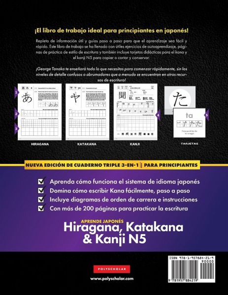 ¡Simplemente nuestro mejor libro de trabajo para principiantes que aprenden japonés! Está repleto de información práctica y útil y guías paso a paso para que el aprendizaje sea más fácil y rápido:Diagramas de orden de trazos e instrucciones de escritura Tarjetas hiragana, katakana y kanji para recortar y guardar Más de 200 páginas de práctica de caligrafía japonesa Introducción a los Sistemas Alfabéticos de Japón Perfecto para niveles principiantes, elementales y de perfeccionamiento Este libro japonés es adecuado tanto para adultos como para niños que quieran aprender Hiragana, Katakana y Kanji, o para aquellos que buscan mejorar sus habilidades de escritura. Ha sido diseñado con ejercicios de autoaprendizaje y páginas de práctica de estilo de cómo escribir. ¡Hemos incluido conjuntos de páginas de tarjetas flash Hiragana, Katakana y Kanji que puede fotocopiar o recortar y guardar también! Su tutor, George Tanaka, le enseñará todo lo que necesita saber sobre los scripts de Kana, ¡con los detalles suficientes para que pueda comenzar rápidamente! Ya sea que vivas en casa o en el extranjero, aprendas por ti mismo o simplemente busques un regalo para un amigo que habla un idioma extranjero, este libro es la mejor manera de comenzar a aprender japonés. Haz clic en "Añadir al carrito" para comenzar tu viaje. Producimos una variedad de útiles libros de texto y recursos que cubren todo tipo de temas. ¡Asegúrese de consultar nuestra página de autor para encontrar su próxima lección!