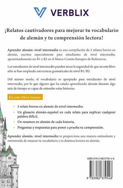 ¡Relatos cautivadores para mejorar tu vocabulario de alemán y tu comprensión lectora! ¿Eres un estudiante de nivel intermedio de alemán que quiere practicar la lectura en este idioma, pero encuentras que la mayoría de material que hay publicado para estudiantes es demasiado fácil o de un nivel demasiado alto para ti? Si ese es tu caso, ¡este es el libro que estabas buscando! Aprender alemán: nivel avanzado - Cuentos en alemán para hispanohablantes es una compilación de cinco relatos breves en alemán, escritos especialmente para estudiantes de nivel intermedio, aproximadamente un B1 o B2 en el Marco Común Europeo de Referencia. Sin gramática avanzada Los estudiantes de nivel intermedio pueden tener la seguridad de que en este libro sólo se han empleado estructuras gramaticales de nivel B1/B2. Vocabulario adaptado para los niveles B1 y B2 Del mismo modo, el vocabulario es apropiado para estudiantes de nivel intermedio, por lo que alguien que ha estado aprendiendo alemán durante algo más de tiempo es capaz de entender estas historias.En Aprender alemán: nivel avanzado tienes:Cinco relato breves en alemán de nivel intermedio. Un glosario alemán-español en cada relato para explicar cualquier palabra difícil o desconocida. Un resumen en alemán de cada historia. Preguntas y respuestas para poner a prueba tu comprensión. Aprender alemán: nivel avanzado te proporciona una manera estimulante y entretenida de mejorar tu vocabulario y tu destreza lectora en alemán. ¡Descarga ahora tu copia de Aprender alemán: nivel avanzado y practica (y con el tiempo, domina) una de las lenguas extranjeras más populares del mundo!