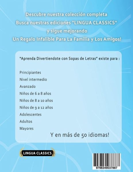 * APRENDA GALLEGO MIENTRAS TE DIVIERTES - ¡AMPLÍA TU VOCABULARIO FÁCILMENTE! ¡Estudiar Gracias a Las Sopas De Letras Es Una Técnica De Aprendizaje Eficaz Que Se Utiliza En Las Escuelas Para Mejorar El Vocabulario - Es Un Juego Ideal Para Estimular El Aprendizaje! Esta serie de libros ha sido diseñada para adaptarse al nivel de cada persona. Tanto para principiantes, como para niveles intermedios o ayudar a su hijo a aprender un nuevo idioma, encontrarán el libro adecuado para sus necesidades. ¿Cómo? Es un excelente complemento para cualquiera que aprenda un idioma. ¡Mejora tu nivel con una actividad estimulante! Con +40 horas de diversión, descubrirás y aprenderás a recordar más de 2000 palabras. UNA FORMA ESTIMULANTE DE ESTUDIAR: - VOCABULARIO ESPECÍFICO POR EDAD Y NIVEL: Disfruta de una selección de +2000 palabras - APRENDIZAJE ACTIVO: Se proporciona espacio para animar al lector a hacer su propia traducción - PUZZLES DE GRAN FORMATO: Diseñados para la mejor legibilidad posible - SOLUCIÓN FÁCIL: Soluciones en un formato claro y sencillo - ENTRETENIENDO: Lo suficientemente difícil para ser un desafío, lo suficientemente fácil para convertirse en un adicto DESARROLLAR SUS HABILIDADES LINGÜÍSTICAS: - Práctica Las sopas de letras convierten el reto de aprender un idioma en un placer! - Progreso Aprende con un vocabulario común adaptado a tus habilidades. - Recuerda lo que aprendes Una técnica de aprendizaje activo para aumentar su vocabulario. - Alcanza tus metas No practiques solo pasivamente. Busca traducciones de nuevas palabras - encuéntralas en el puzzle - ¡Añádelas a tu vocabulario! DISPONIBLE EN MÁS DE 50 IDIOMAS PARA: - Principiantes -Niveles Intermedios - Avanzados - Niños de 6 a 8 años - Niños de 8 a 10 años - Niños de 9 a 12 años - Adolescentes - Adultos - Ancianos Descubre nuestra colección completa - busca ""LINGUA CLASSICS"" y descubre nuevos libros para mejorarte - ¡Un regalo infalible para tu familia y amigos! ¡Disfrute de esta divertida experiencia de aprendizaje ahora - Háganse amigos con un nuevo idioma fácilmente! ------- [ENGLISH] ------- Note: Some content in English might be missing due to length restrictions. * LEARN GALICIAN WHILE HAVING FUN - BUILD VOCABULARY EASILY! Word Searches Are an Effective Technique Used in Schools to Increase Vocabulary - It’s an Ideal Game to Stimulate Learning! This book series has been tailored to each person’s specific level. Whether you are a beginner, advanced, or helping your child learn a new language you’ll find the right book for your needs. Why? It’s a great complement for anyone learning a language. Make it easy with an encouraging activity! With +40 hours of entertainment, you will discover and be able to retain over 2000 words: AN EXCITING STUDY COMPANION WITH: - AGE & LEVEL SPECIFIC VOCABULARY: Enjoy a curated selection of +2000 adapted words - ACTIVE LEARNING: Space provided beside each term to encourage the reader to self-translate - PUZZLES IN FULL PAGE FORMAT: Designed for the best readability