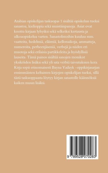 Arabian opiskelijan taskuopas 1 sisältää opiskelun tueksi sanastoa, kielioppia sekä muistiinpanoja. Asiat ovat koottu kirjaan lyhyiksi sekä selkeiksi kertausta ja ulkoaopiskelua varten. Sanastolistoihin kuuluu mm. vaatteita, hedelmiä, eläimiä, kellonaikoja, ammatteja, numeroita, perheenjäseniä, verbejä ja niiden eri muotoja sekä erilaisia partikkeleita ja hyödyllisiä lauseita. Tämä painos sisältää sanojen monikot yksiköiden lisäksi sekä yli sata verbiä taivutuksien kera. Kirja sopii erinomaisesti Bayna Yadayk -oppikirjasarjan ensimmäisten keltaisten kirjojen opiskelijan tueksi, sillä tästä taskuoppaasta löytyy kirjan sanastolle käännöksiä kaiken muun lisäksi.