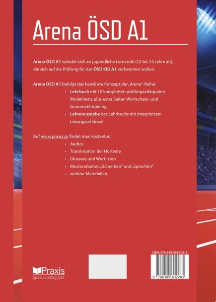Arena ÖSD A1 (KID A1) ist für Lernende ab 10 Jahren gedacht, die sich gründlich und umfassend auf die sehr beliebte DaF-Prüfung "ÖSD-KID A1" vorbereiten wollen. Im ersten Test wird das Format der Prüfung Modul für Modul präsentiert und die empfohlenen Lösungsstrategien Teil für Teil erläutert.Arena ÖSD A1 kann entweder in einem reinen Prüfungsvorbereitungskurs oder ab Mitte eines gewöhnlichen A1-Kurses parallel zu jedem kurstragenden Lehrwerk eingesetzt werden.Das Lehrwerk deckt in allen Aufgaben sämtliche Themenbereiche der A2-Prüfung ab und bietet dabei mit vielen Zusatzaufgaben ein systematisches Grammatik- und Wortschatztraining. Arena ÖSD A1 wiederholt mit einer Reihe von Zusatzaufgaben (aufsteigender Schwierigkeitsgrad) die gesamte A1-Grammatik und füllt somit etwaige Lücken im Lernstoff aus.Arena ÖSD A1 liegt voll auf A1-Niveau, wurde ausführlich ausprobiert und führt den Prüfungskandidaten die Prüfung von Anfang an im zu erwartenden Schwierigkeitsgrad vor, sodass unangenehme Überraschungen vermieden werden.Die Lösungen zu allen Übungen sind in der Lehrerausgabe enthalten.
