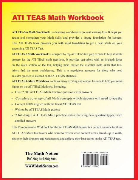 Prepare for The ATI TEAS 6 Math Test with a Perfect Workbook! ATI TEAS 6 Math Workbook is a learning workbook to prevent learning loss. It helps you retain and strengthen your Math skills and provides a strong foundation for success. This ATI TEAS book provides you with solid foundation to get a head starts on your upcoming ATI TEAS Test. ATI TEAS 6 Math Workbook is designed by top ATI TEAS test prep experts to help students prepare for the ATI TEAS math questions. It provides test-takers with an in-depth focus on the math section of the test, helping them master the essential math skills that test-takers find the most troublesome. This is a prestigious resource for those who need an extra practice to succeed on the ATI TEAS Math test. ATI TEAS 6 Math Workbook contains many exciting and unique features to help you score higher on the ATI TEAS Math test, including: * Over 2,500 ATI TEAS Math Practice questions with answers * Complete coverage of all Math concepts which students will need to ace the ATI TEAS test * Content 100% aligned with the latest ATI TEAS test * Written by ATI TEAS Math experts * 2 full-length ATI TEAS Math practice tests (featuring new question types) with detailed answers This Comprehensive Workbook for the ATI TEAS Math lessons is a perfect resource for those ATI TEAS Math test takers who want to review core content areas, brush-up in math, discover their strengths and weaknesses, and achieve their best scores on the ATI TEAS test Published By: The Math Notion www.mathnotion.com