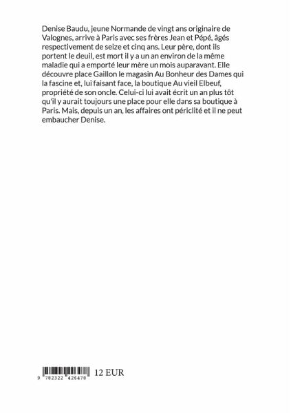 Denise Baudu, jeune Normande de vingt ans originaire de Valognes, arrive à Paris avec ses frères Jean et Pépé, âgés respectivement de seize et cinq ans. Leur père, dont ils portent le deuil, est mort il y a un an environ de la même maladie qui a emporté leur mère un mois auparavant. Elle découvre place Gaillon le magasin Au Bonheur des Dames qui la fascine et, lui faisant face, la boutique Au vieil Elbeuf, propriété de son oncle. Celui-ci lui avait écrit un an plus tôt qu'il y aurait toujours une place pour elle dans sa boutique à Paris. Mais, depuis un an, les affaires ont périclité et il ne peut embaucher Denise.