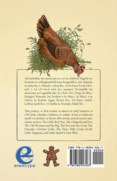 Ad·midethar int auraicept-so, nó in cétlebor léigind-se, éicsíniu nó cét¿oglaimthidi inna Sengoídilce, eter chlanda écodnacha ¿ chlanda codnacha. At·tá forus focal fobec and .i. trí cét focal acht bec nammá. Do·aissilbi int auraicept noí ngnáthscéla: In Cherc Bec Derg, In Macc Bairgine Sinnséir, Int ¿enben ¿ in Mucc, In Macc ¿ in Gabor, In Srubán Aigin, Éiréne Bec, Trí Buicc Gairb, Lethscrepull Bec, ¿ Chétlín in Damáin Allaid Bic. This primer, or first reader, is aimed at early learners of Old Irish, whether children or adults. It has a relatively small vocabulary of about 300 words, and presents nine classic stories: The Little Red Hen, The Gingerbread Boy, The Old Woman and the Pig, The Boy and the Goat, The Pancake, Chicken Little, The Three Billy Goats Gruff, Little Tuppens, and Little Spider's First Web.