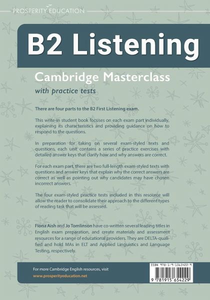 Preparation for the Cambridge B2 First There are four parts to the B2 First Listening exam. Write-in student book This write-in student book focuses on each exam part individually, explaining its characteristics and providing guidance on how to respond to the questions. In preparation for taking on several exam-styled texts and questions, each unit contains a series of practice exercises with detailed answer keys that clarify how and why answers are correct. Full-length exam-styled texts with answer keys For each exam part, there are two full-length exam-styled texts with questions and answer keys that explain why the correct answers are correct as well as pointing out why candidates may have chosen incorrect answers. Additional practice tests The additional four exam-styled practice tests included in this resource will allow the reader to consolidate their approach to the different types of reading task that will be assessed. About the authors Fiona Aish and Jo Tomlinson are directors of Target English, a consultancy that provides tailor-made solutions in content creation, course provision, training and testing. They have co-written several leading titles in English exam preparation, and create materials and assessment resources for a range of educational providers. They are DELTA-qualified and hold MAs in ELT and Applied Linguistics and Language Testing, respectively. For more Cambridge English resources, visit www.prosperityeducation.net