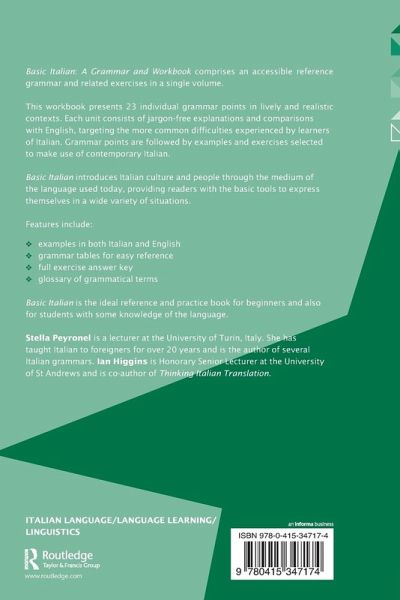 Presenting twenty-three individual grammar points in lively and realistic contexts, Basic Italian is an accessible reference grammar with related exercises in one, easy to follow volume. Each unit consists of jargon-free explanations and comparisons with English, which focus upon the more common difficulties experienced by learners of Italian.