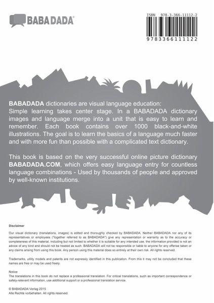 BABADADA dictionaries are visual language education: Simple learning takes center stage. In a BABADADA dictionary images and language merge into a unit that is easy to learn and remember. Each book contains over 1000 black-and-white illustrations. The goal is to learn the basics of a language much faster and with more fun than possible with a complicated text dictionary. This book is based on the very successful online picture dictionary BABADADA.COM, which offers easy language entry for countless language combinations - Used by thousands of people and approved by well-known institutions. The…mehr