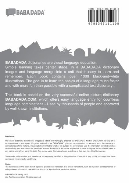 BABADADA dictionaries are visual language education: Simple learning takes center stage. In a BABADADA dictionary images and language merge into a unit that is easy to learn and remember. Each book contains over 1000 black-and-white illustrations. The goal is to learn the basics of a language much faster and with more fun than possible with a complicated text dictionary. This book is based on the very successful online picture dictionary BABADADA.COM, which offers easy language entry for countless language combinations - Used by thousands of people and approved by well-known institutions. The…mehr