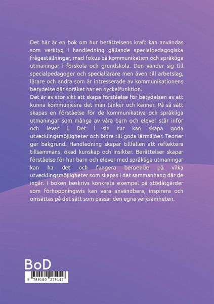 Det här är en bok om hur berättelsens kraft kan användas som verktyg i handledning gällande specialpedagogiska frågeställningar, med fokus på kommunikation och språkliga utmaningar i förskola och grundskola. Den vänder sig till specialpedagoger och speciallärare men även till arbetslag, lärare och andra som är intresserade av kommunikationens betydelse där språket har en nyckelfunktion. Det är av stor vikt att skapa förståelse för betydelsen av att kunna kommunicera det man tänker och känner. På så sätt skapas en förståelse för de kommunikativa och språkliga utmaningar som många av våra barn och elever står inför och lever i. Det i sin tur kan skapa goda utvecklingsmöjligheter och bidra till goda lärmiljöer. Teorier ger bakgrund. Handledning skapar tillfällen att reflektera tillsammans, ökad kunskap och insikter. Berättelser skapar förståelse för hur barn och elever med språkliga utmaningar kan ha det och fungera beroende på vilka utvecklingsmöjligheter som skapas i det sammanhang där de ingår. I boken beskrivs konkreta exempel på stödåtgärder som förhoppningsvis kan vara användbara, inspirera och omsättas på det sätt som passar den egna verksamheten.