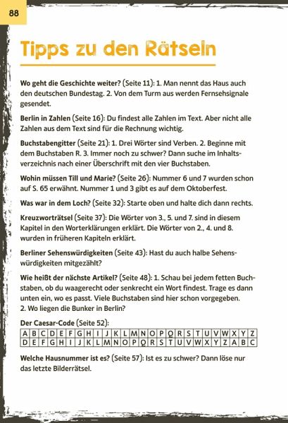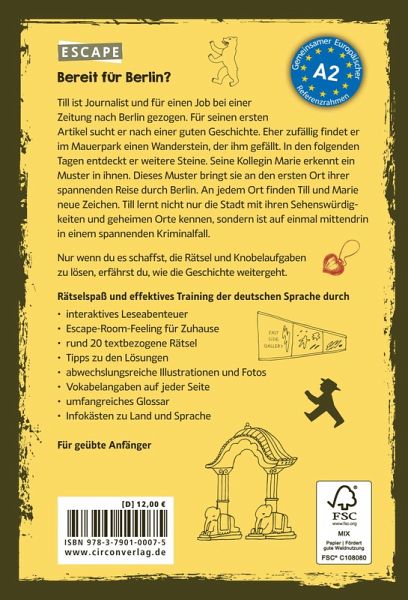 Spannung und Rätselspaß auf Deutsch: Mit den kniffeligen Escape-Geschichten macht Sprachen lernen Spaß - und wer mit Spaß lernt, lernt erfolgreicher! Von einer Muttersprachlerin verfasst: Die Geschichte wurde von einer muttersprachlichen Autorin mit Lehrerfahrung verfasst und/oder korrigiert. Hoher Unterhaltungswert: Die rund 20 textbezogenen, abwechslungsreichen Rätsel bringen jede Menge Spaß beim Lesen, die vielen farbigen Illustrationen veranschaulichen die Story und bringen den Leser_innen den Flair Berlins nahe. Umschreibungen auf jeder Seite, einfache Sätze & zusätzliche Tipps: Die Wörter, die über das Sprachniveau A2 hinausgehen, werden beim ersten Auftreten auf jeder Seite übersetzt und sind ohne umständliches Blättern sofort griffbereit. Immer wieder gibt es hilfreiche Tipps, sodass die Rätsel leichter gelöst werden können und die Leser_innen erfahren, wie die Geschichte weitergeht. Zusätzlicher Bonusteil: mit weiteren Knobeleien, Wissenswertem zur Berliner Geschichte und Tipps für den nächsten Berlin-Besuch. Hilfestellungen zu den Rätseln, Lösungen