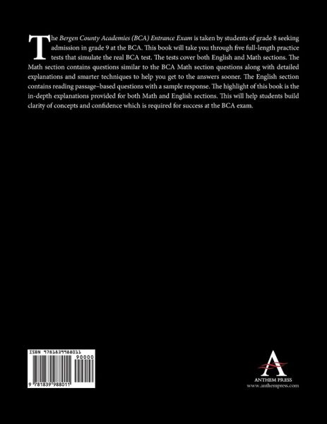 The Bergen County Academies (BCA) Entrance Exam is taken by students of grade 8 seeking admission in grade 9 at the BCA. This book will take you through five full-length practice tests that simulate the real BCA test.