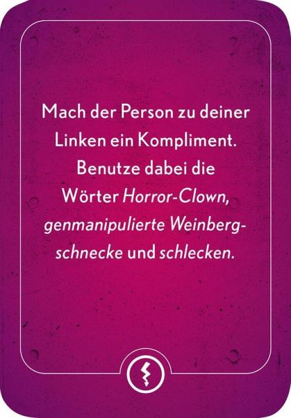 Bekanntes Spiel, das jede:r kennt: Karten ziehen und los geht's!So steigt die Stimmung: 50 Karten mit "fiesen" Partyaufgaben und schrägem HumorWitziges Geschenk: Perfekt als Mitbringsel oder Gastgeschenk zur Party, zum Geburtstag, zu Silvester oder einfach so