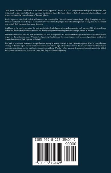 "Blue Prism Developer Certification Case Based Practice Question - Latest 2023" is a comprehensive study guide designed to help professionals prepare for the Blue Prism Developer Certification Exam. This latest edition of the book includes a collection of case-based practice questions that cover all aspects of the exam syllabus. The book provides an in-depth analysis of the exam topics, including Blue Prism architecture, process design, coding, debugging, and more. The case-based questions are designed to simulate real-world scenarios, helping candidates build their problem-solving skills and understand how to apply their knowledge in practical situations. In addition to the practice questions, the book also includes detailed explanations and solutions for each question. This helps candidates understand the reasoning behind each answer and develop a deeper understanding of the key concepts covered in the exam. The latest edition of the book has been updated with the latest exam patterns and includes additional practice questions to help candidates prepare for the certification exam. With this book, aspiring Blue Prism developers can improve their chances of passing the certification exam and demonstrate their expertise in the field. This book is an essential resource for any professional seeking to become certified in Blue Prism development. With its comprehensive coverage of the exam topics, realistic case-based scenarios, and detailed explanations of each answer, it is the perfect tool to help candidates master the material and pass the certification exam with confidence. Whether you're a seasoned developer or just starting out in the field of Robotic Process Automation, this book is a must-have for your certification journey.