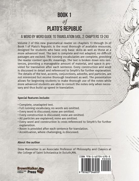 Volume 2 of this new grammatical reader on chapters 13 through 24 of Book 1 of Plato's Republic is the most thorough of available resources, designed for students who have only basic skills as well as those at a more advanced level. The text is complete and not adapted; no difficult passages are excised. The running vocabularies are complete, providing the reader context specific meanings. The text is broken down into sentences, providing a manageable amount of material, and space is provided for translation after each sentence. Every construction and word is discussed in detail and referenced to Smyth's Greek Grammar for further explanation. The details of the text, accents, conjunctions, adverbs, and particles, are not minimized but receive thorough treatment as well. The presentation allows for beginning students to make thorough use of the notes while more advanced students are able to consult the notes only when necessary and thus build up speed in translation. Special features include: 1) Complete, unadapted text. 2) Full running vocabulary; no words are omitted. 3) Every word is discussed; none are omitted. 4) Every construction is discussed; none are omitted. 5) All particles are explained; none are omitted. 6) Every word and construction is cross referenced to Smyth?s Greek Grammar for further explanation. 7) Room is provided after each sentence for translation. 8) Accentuation, where challenging, is discussed.