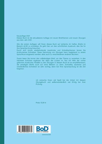 Neuauflage 2021Dieses Buch ist die aktualisierte Auflage mit neuen Briefthemen und neuen Übungen aus dem Jahr 2021. Wie die ersten Auflagen will Ihnen dieses Buch auf einfache Art helfen, Briefe im Bereich A2-B1 zu schreiben. Es geht hier um den schriftlichen Ausdruck, den Sie für Ihre Sprachprüfung brauchen. Durch sich immer wiederholende Ausdrücke und Schreibschemen lernen Sie strukturiertes Schreiben. Diese Sammlung von Übungen kann begleitend zu einem Sprachkurs eingesetzt werden, aber auch zu verschiedenen anderen Büchern. Zuerst lesen Sie immer den vollständigen Brief, um das Thema zu verstehen. In den nächsten Schritten ergänzen Sie dann die Lücken im Text mit Hilfe der vorher gelernten Ausdrücke. Parallel zu den Übungen in diesem Buch ist es empfehlenswert, die jeweiligen Brfiefe auch auf extra Blättern zu üben. Schnelles, sauberes und verständliches Schreiben ist sehr wichtig, denn bei Ihrer Sprachprüfung ist die Zeit begrenzt. Ich wünsche Ihnen viel Spaß bei der Arbeit mit diesem Übungsbuch und viel Erfolg bei Ihrer Prüfung.
