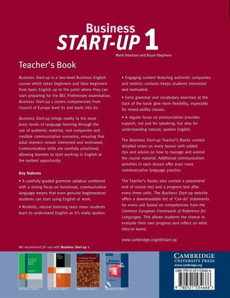 Business Start-up is a two-level (CEF level A1/A2) Business English course for adults who need English for their work. The Teacher's Book contains detailed notes on every lesson with added tips and advice on how to manage and extend the course material. Additional communication activities in each lesson offer even more communicative language practice. The Teacher's Book also contains a placement/end of course multiple choice test and progress tests after every three units. The Business Start-up website offers a downloadable list of Can-do statements for every unit based on competencies from the Common European Framework of Reference for Languages, allowing students the chance to reflect on what they've learnt and evaluate their own progress.